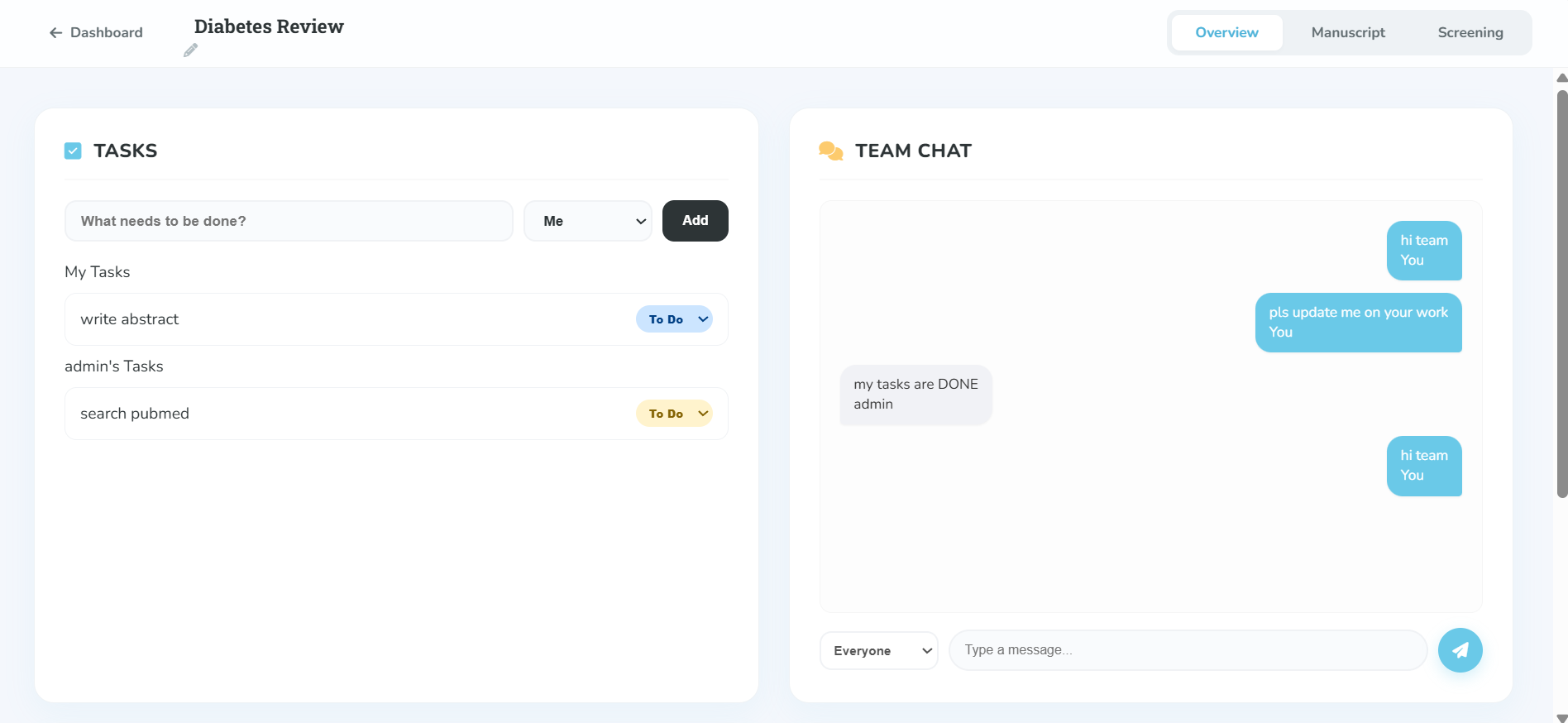 Real-time chat, task assignment, and role management for your research group.
